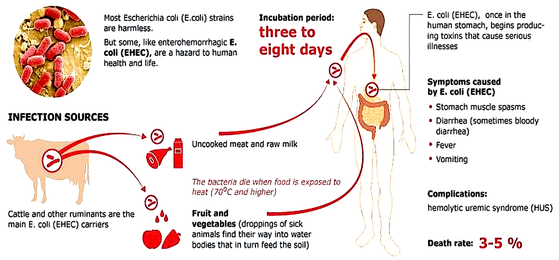 E. coli are bacteria found in many places, including the intestines of people and animals. The highly-infectious E. coli strain, O157:H7, is found only in the intestines of ruminant animals (such as Cows) and people infected with it. Human’s harboring this strain can suffer from diarrhea, urinary tract infections, pneumonia, sepsis, and most life-threatening of all, hemolytic uremic syndrome (HUS). HUS can lead to kidney failure, permanent health problems, and even death.